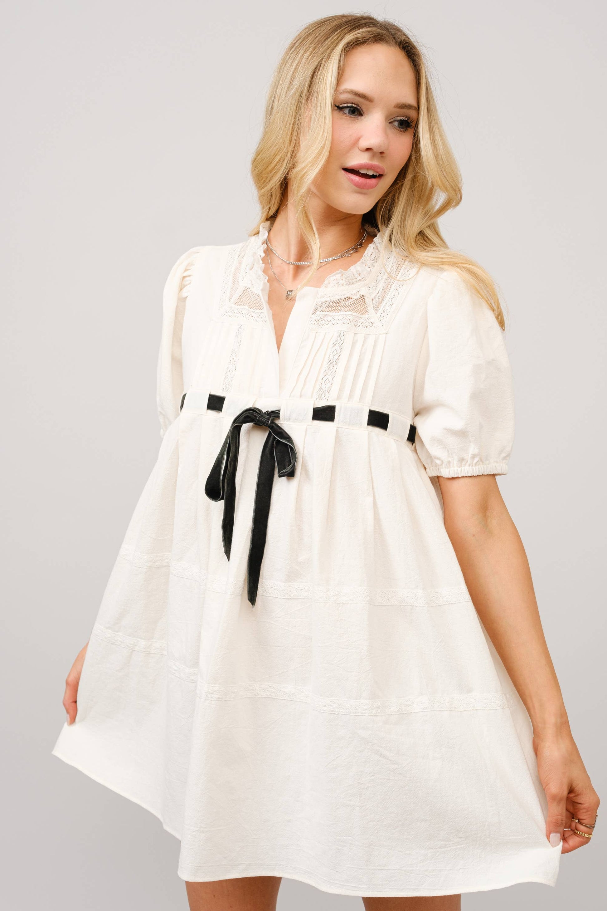 Featuring lace tape detailing and tiered design, this dress has a bow front and puff sleeves for a charming look.